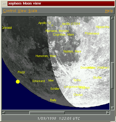 ![]() La fase lunar para el 1 sep 1998, a 6x. Se divisa con claridad el terminador lunar y se identifican los nombres de los cráteres más brillantesSi uno, en cambio, es de los que le gusta meter mano en todo, y compilar los programas que utiliza en su propio ordenador, seguramente metiendo un poco de mano en el código fuente (como debería ser ;-), entonces también vamos a necesitar, además de las herramientas propias para compilar un programa que correrá bajo X11 (y está escrito en C), las librerías Motif. Como estas no son ni gratis ni libres, quizá quieras probar con LessTiff, que sí lo son, y cuya última versión parece ser estable (0.8x). Normalmente, en un sistema Linux, las herramientas necesarias para compilar XEphem ya estarán instaladas, si uno por ejemplo instaló los paquetes D y XD de la distribución Slackware. Estos paquetes contienen el compilador gcc de GNU, GNU make, las librerías de X, xmkmf (aunque este último no es necesario si uno es lo suficientemente macho como para editar a mano un fichero Makefile que viene con la distribución de XEphem) y un montón de ficheros *.h que no deben faltar en ningún sistema bien montado. Tambien existe un paquete rpm con XEphem, en los espejos FTP de la distribución Red Hat Linux.