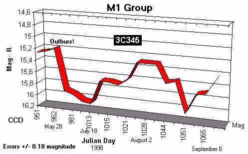 Estrellas de comparación tomado de Smith et al., 1985, AJ 90, 1184.Existe una participación, en este tipo de objetos, por parte de aficionados avanzados que pueden contribuir con buenos resultados, el WEBT (Whole Earth Blazar Telescope) es una red de telescopios que esta por todo el mundo, su función, es obtener resultados observacionales en óptico y se pueden incorporar aficionados con cámaras CCD y filtros V y R. El Grupo M1 colabora observando este tipo de objetos, alertando a las redes de observación que están por todo el planeta. Si alguno de vosotros esta interesado en participar en estos trabajos solo tiene que ponerse en contacto con el autor. Este año hemos observado varios cuásares importantes el 3C 345 es un Blazar muy energético que tiene oscilaciones muy continuadas, estas oscilaciones varían de la magnitud R 15,30 a 16,20. Diego Rodríguez captó una de las subidas el día 28 de mayo de 1998, a lo largo de los meses este objeto va oscilando teniendo subidas cada vez menos acusadas. Representamos aquí la curva preliminar de luz que hemos obtenido. ![]()