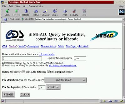 Página web del Centro de Datos Astronómicos de Estrasburgo.El siguiente paso lo da el francés Charles Messier un milenio y medio más tarde. Messier, con su modesto telescopio, anotó aquellos objetos de aspecto difuso que estaban fijos en su posición, pero su lista apenas pasaba de la centena. La primera versión de su ristra de objetos se publicó en "Memoires de l'Academie" hacia 1771 cubriendo desde M1 hasta M45. Nueve años después añadió doce objetos más en "Connaissance des Temps". Finalmente, en la reimpresión de dicho libro en 1784 se comentaban los 103 objetos "messier". Actualmente el catálogo de Messier consta de 110 objetos, los cuales no aparecieron en ninguna versión actualizada de ninguna publicación, sino que se añadieron a su lista personal. Un avance definitivo en el estudio y catalogación de los objetos difusos del cielo lo realizó J. L. E. Dreyer, natal de Alemania pero que emigró a Irlanda para trabajar en el gran observatorio de Lord Rosse, situado en Parsonstown. En este lugar se construyeron varios telescopios gigantes, que culminaron con el Leviatán de Parsonstown, un reflector de 1,8 metros de diámetro. Dreyer trabajaba como observador en este observatorio y después de un tiempo observando detalladamente el cielo, creyó conveniente actualizar el "Catálogo General" de nebulosas y cúmulos estelares realizado por Sir John Herschel de 1864. Dreyer publicó en 1878 un suplemento al Catálogo General con mil objetos no estelares nuevos. Una década más tarde, la Real Sociedad Astronómica le sugirió que publicase un "nuevo catálogo general". Después de actualizar la lista con otros 1500 nuevas nebulosas y cúmulos, en 1888 apareció el "Nuevo Catálogo General de Nebulosas y Cúmulos Estelares". En esta lista, Dreyer había ordenado y numerado los objetos por ascención recta. Para compilar tan ingente catálogo, Dreyer tuvo que acudir a notificaciones y publicaciones donde se detallaban la posición y naturaleza de los descubrimientos y, ocasionalmente, observar por sí mismo la veracidad de los datos. Por tanto, el NGC original posee algunos errores. Hoy en día la mayoría de catálogos existentes se realizan con la ayuda de tecnología digital, léase satélites artificiales y procesamiento automatizado. Hasta hace pocos años, el catálogo de estrellas más conocido era el GSC o Hubble Guide Star Catalogue, que posee nada menos que 15 millones de estrellas. Actualmente, ha sido relegado por el Hipparcos y el USNO-A1. El Hipparcos ha sido producido gracias al satélite europeo del mismo nombre que registró la posición y brillo de dos millones de estrellas con precisión inusitada. Uno de los lugares principales para la búsqueda de información catalogada es Simbad (http://cdsweb.u- strasbg.fr/Simbad.html). Este servicio está mantenido por el Centro de Datos Astronómicos de Estrasburgo. El CDS colecciona y distribuye catálogos de datos relacionados con la observación de estrellas, galaxias y otros objetos galácticos y extragalácticos, aunque también poseen algunos otros sobre objetos del sistema solar e información atómica. Las estadísticas del CDS son significativas: 2837 catálogos disponibles a través de sus páginas. Simbad permite navegar por estas listas buscando un objeto o posición celeste en concreto. Volviendo a nuestra supernova ¿qué es lo que encontramos en su posición? En la circular de la UAI se informa que su posición es AR: 19h 35m 03s,31 y Dec: -52$\deg$ 50' 44",8. Una consulta al Simbad nos informa que existen multitud de objetos, en concreto un cúmulo de galaxias (Str 1931-529) y tres galaxias. Efectivamente, aparece la galaxia ESO 184-G82 de la que se habla en dicha circular. Cerca de la supernova existe una estrella de magnitud 10, la PPM 774094. Aunque Simbad muestra algunos datos complementarios al nombre del objeto como resultado de la consulta, podemos obtener más información rebuscando en los archivos con un simple clic de ratón en el nombre del objeto. Entre la información que podemos pedir se incluye la bibliografía científica en la que se hace mención. En la actualidad, haciendo un consulta al Simbad podemos encontrar las entradas en los archivos para la explosión de rayos gamma y la supernova SN1998 bw. De forma similar, podemos consultar el catálogo Hipparcos o GSC para conocer las estrellas de comparación que existen alrededor de la supernova.