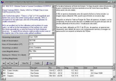 Figura1. Apariencia del MLS 1.0Como se puede apreciar, existen tres áreas claramente diferenciadas en el programa. En la parte izquierda se suministra el comentario de Steeve Waldee para cada uno de los objetos de Messier, mientras que a la derecha aparece el área donde el usuario del programa registra su observación. En la parte inferior aparecen los datos técnicos, que incluyen coordenadas celestes, tipo de objeto (galaxia, nebulosa planetaria, cumulo abierto, etc.), Magnitud, dimensiones y distancia a la Tierra en miles de años-luz.
