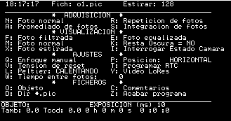 Menú de control.El menú de control (figura 5) se divide en cuatro bloques: adquisición, visualización, ajustes y ficheros. La línea superior y las dos inferiores son informativas. En adquisición podemos tomar una foto normal. Realizar múltiples fotos. Promediar múltiples fotos. Y por ultimo sumar múltiples tomas. En visualización tenemos varias formas de visualizar la imagen. La única que admite parámetros para la presentación es el estirado, las demás están predefinidas. La función "Interrogar Estado Cámara", actualiza los datos de la línea inferior de la pantalla. Podemos saber la temperatura del CCD, la temperatura ambiente y la hora de la cámara. La sección de ajustes es la mas amplia. En primer lugar, permite enfocar la cámara. Para esto, se visualizan de forma continua 25 líneas de la imagen. Esta franja se puede mover a través de todo la imagen con los cursores. A continuación esta la opción de posición que permite girar la imagen 90 grados. La opción "Tensión de reset" es útil para ajustar un potenciometro de la cámara que determina el nivel de la tensión de reset. La opción "Programar el RTC", pasa al reloj en tiempo real de la cámara, la hora del PC. Esta operación se realiza de tarde en tarde dado que es un reloj de cuarzo bastante estable. Esta hora es la que se coloca en la cabecera de la imagen. Hasta no hace mucho, los relojes de los ordenadores personales han dejado bastante que desear. La función "Peltier" simplemente arranca y para el proceso de enfriado. La opción "Vídeo LoRes" conmuta la resolución de la presentación, pasando del modo 320x240 a otro superior. La ultima función, "Tiempo entre fotos", permite espaciar las tomas en el tiempo que al hacer una tanda de fotos. En "Ficheros" tenemos dos ordenes para introducir datos a la cabecera del fichero. Uno es el nombre del objeto y el otro un comentario general. Por ultimo se puede hacer un listado de las imágenes obtenidas sin tener que abandonar el programa.