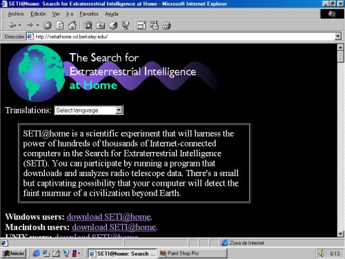 La página del proyecto SETI@home es probablemente la web astronómica más visitada de los últimos días. Ciertamente esto se intuye a partir del gran éxito que este ambicioso proyecto ha suscitado a lo largo y ancho del planeta. Son cientos de miles los que han decidido aportar su potencial informático (apenas se necesitan 32 Mb de RAM y conexión a Internet) para tener la oportunidad de participar en la siempre cautivadora búsqueda de inteligencia extraterrestre, aunque las probabilidades sean mínimas. No en vano, en el momento que se escribe este documento, el número de personas que han descargado el cliente asciende a 274.555. Esto supone un ejemplo de trabajo en paralelo con un potencial de cálculo sin precedentes.