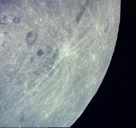 Crácter en la cara oculta de la Luna fotografiado por el Apolo 13. El cráter Joliot-Curie está situado entre el Mare Marginus y el cráter con radios. (NASA)Mientras una parte del equipo planteaba estas inquietudes, otros técnicos de Houston habían logrado averiguar grosso modo lo que había ocurrido. Todo había tenido lugar en la llamada Sección 4 del módulo de servicio. Consistente en seis secciones, la cuarta sección era la encargada de proporcionar la energía eléctrica al complejo Apolo. Allí estaban las celdas de combustible, alimentadas por un gran depósito de hidrógeno y dos depósitos de oxígeno. Alguno de estos depósitos había explotado. Ahora resultaba imposible pensar en un descenso en la Luna; la prioridad era regresar la tripulación a la Tierra.