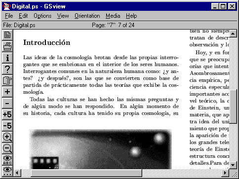 Ghostscript & GSview.IntroducciónAunque actualmente Astronomía Digital usa el formato PDF, las primeras revistas se encuentran disponibles en formato PostScript para su impresión y difusión directa. Este formato es en realidad un lenguaje que algunas impresoras leen directamente, pero la mayoría no. Por ello es necesario un programa que traduzca los comandos de PostScript a los que reconoce su impresora. GhostScript se encarga de esto. Pero ademas, el programa que lo acompaña, GSview, permite leer directamente en su monitor la revista.El GSview es, en filosofía y apariencia, muy similar al programa